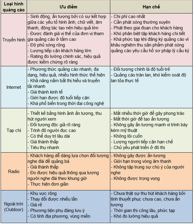 Tuy nhiên ở mỗi thời điểm, vùng miền địa lý khác nhau khách hàng lại có nhu cầu sử dụng loại hình khác nhau. Điều đó tạo nên sự cạnh tranh mạnh mẽ giữa các loại hình quảng cáo. Bởi vậy, hình thức quảng cáo truyền thống trên truyền hình cũng đang có nhiều sự thay đổi tích cực để duy trì và tăng trưởng trong bối cảnh các phương tiện truyền thông mới đang ngày càng vươn lên mạnh mẽ.