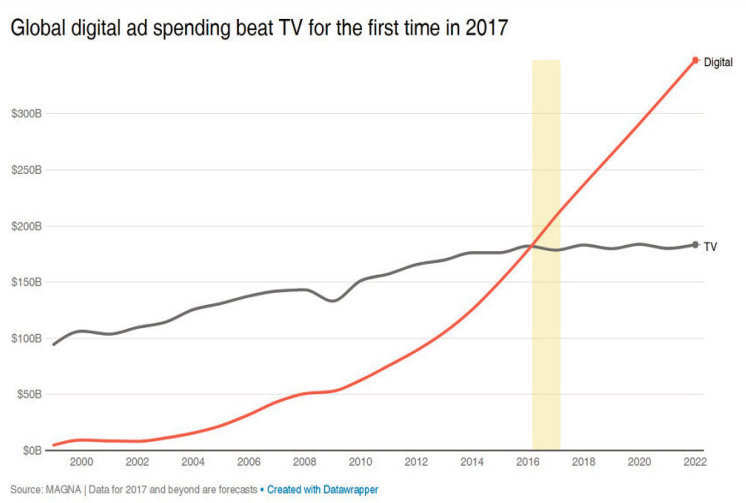 Trong cuộc đua quảng cáo, nỗ lực giành chiếm thị phần của truyền hình khá nhiều áp lực trước sức càn quét ngày càng mạnh mẽ của hai ông lớn công nghệ Facebook và Google. Theo đó, giới chuyên môn dự báo khoảng cách doanh thu giữa hai loại hình quảng cáo này sẽ còn tiếp tục gia tăng trong thời gian tới.